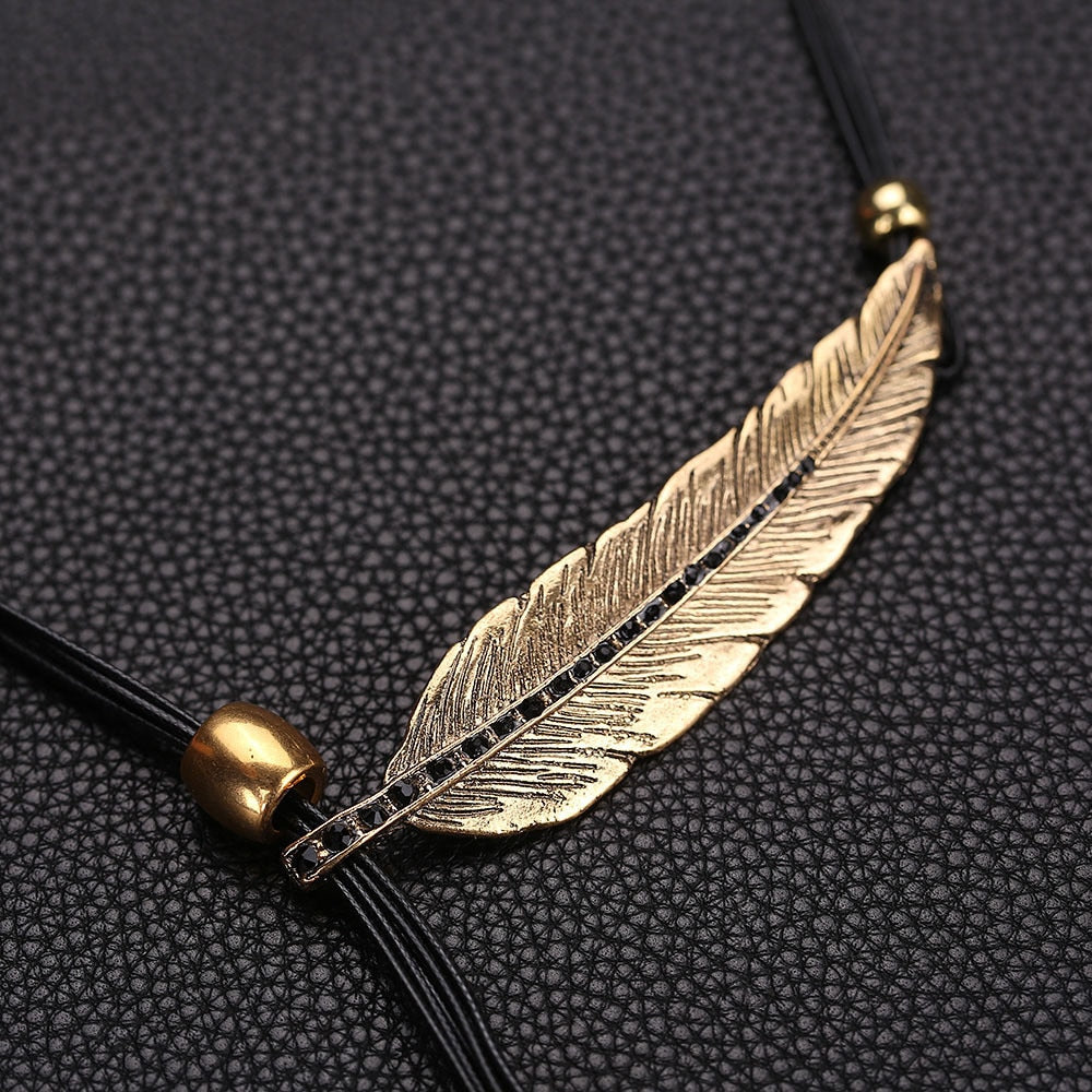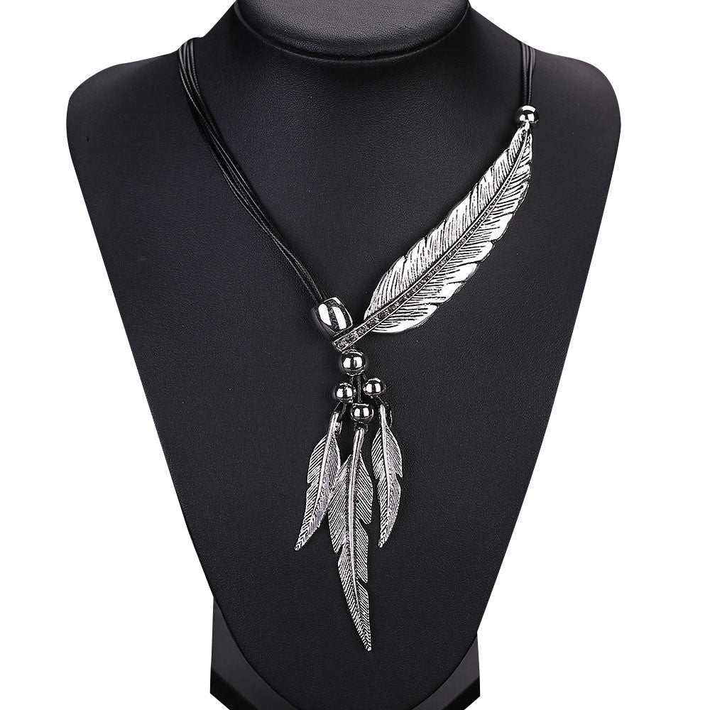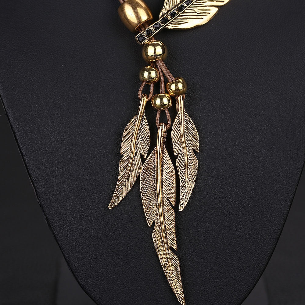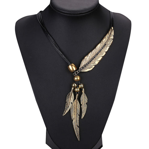 This beautiful necklace features fine crafted metal alloy feathers & contrasting brass coloured beads together with a leather styled rope chain necklace.
